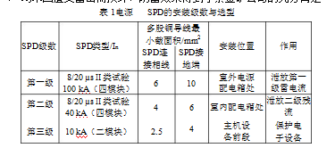 由于雷電沖擊波的主要能量集中在從工頻附近幾十赫茲到幾百赫茲的低端,所以,雷電沖擊波能量很容易與工頻回路發生耦合、諧振。雷電沖擊波從電源線路進入電子設備的概率比從信號線中進入的概率要高得多。據統計,約有80%的電子設備雷擊損壞事故是由電源線路引入閃電電涌造成的,因此,應特別加強系統中設備電源的防雷措施。在選型時,要選擇殘壓小、響應時間快的SPD。電源 SPD的選擇、安裝情況如表1所示。