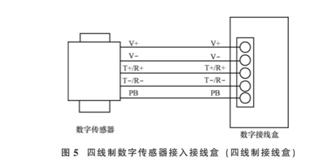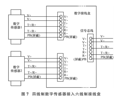 線制傳感器一般使用四線制接線盒。 數字傳感器與接線盒連接按 “同名接線端相連 ” 的原則進行連接, 即傳感器電源 V+接接線盒中的 V+,