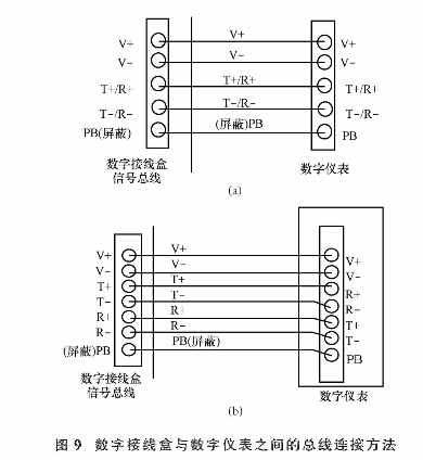 數字接線盒連接數字儀表是通過一條信號總線連接。 接線原則要根據數字傳感器的線制來決定。 四線制數字接線盒與儀表按 “ 同名端連接 ” 原則進行連接。 六線制數字接線盒與儀表是按照“電源同名端連接”, “信號線發送連接接收 , 正對正, 負對負 ” 的原則接線。  如圖 9(a)、 (b)所示, 分別是四線制和六線制數字接線盒與數字儀表的總線連接方法示意。