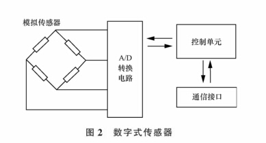 數字式傳感器的概念是與輸出模擬信號的模擬傳感器相對而言的, 數字式傳感器是指可輸出數字信號的傳感器。 現階段使用的數字式傳感器包括模擬傳感器、 A/D 轉換電路、 控制單元 、 數據通信接口 (如圖 2 所示)。