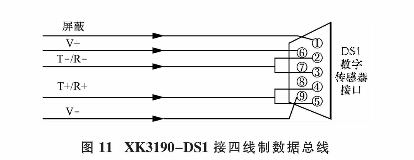 四線制 (RS485 半雙工方式) 時, 應采用半雙工方式連接, 此時在做總線連接頭時應采用圖10 的連法 。 圖 11 中 , 在總線連接 9 芯 D 型插頭時, 應將 2、 3 腳短接, 作為數字傳感器的信號負(T-/R-), 將 4、 5 腳短接作為數字傳感器的信號正 (T+/R+)。