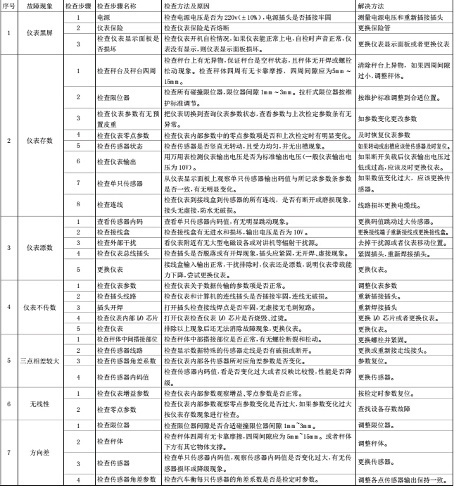 4.1 故障查找的順序、步驟先機械部分,后電氣部分;先儀表部分,后連接部分;先接線盒,后傳感器。可根據現場司磅員電話中反映的設備故障現象做出初步故障類型判斷,帶齊常用工具和所需的特殊工具及備件。到現場后先觀察儀表,根據數字儀表的錯誤提示(數字儀表能提示設備錯誤信息和每只傳感器的工作狀態)確定設備故障點進行處理。祥見表 1 儀表和計算機常見故障