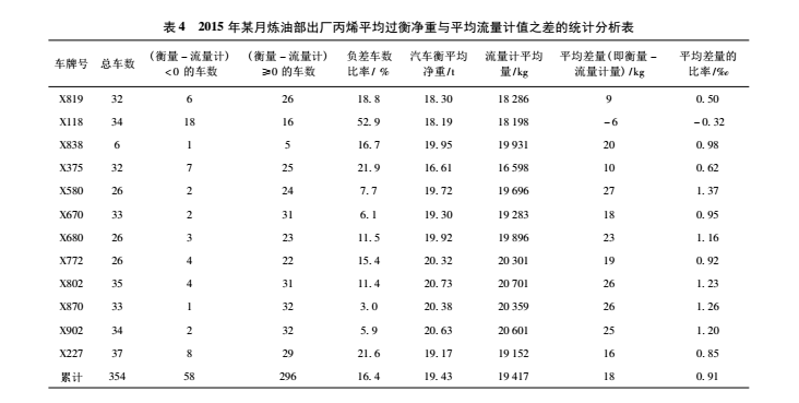 表 4 中的 12 輛車是當月進煉油部裝載丙烯的全部車輛,從數據分析可以看出,X118 車輛非常可疑:  差量 = 衡量 - 流量計為負差的車數比率最高,為 52. 9% ,平均差量比率最小,為 - 0. 32‰。