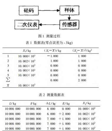 下面介紹具體計算過程:選擇型號為SCS-30的原料廠地磅,其測量范圍為0噸至30噸,檢定分度值為10千克。在10噸測量點對選用地磅進行5次重復測量,測得值為Xi,測量結果見1 和表 2。