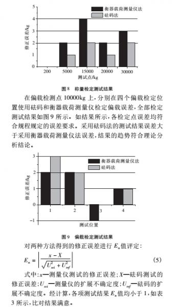 在遞增稱量點(diǎn) 200kg、5000kg、15000kg、20000kg、 30000kg 上,分別使用砝碼和衡器載荷測量儀檢定稱量誤差,全部檢定測試結(jié)果如圖 8 所示。如結(jié)果所示,各檢定點(diǎn)誤差均符合規(guī)程規(guī)定的誤差要求。采用砝碼法的測試結(jié)果誤差小于采用衡器載荷測量儀法誤差,結(jié)果的趨勢符合理論分析結(jié)論。