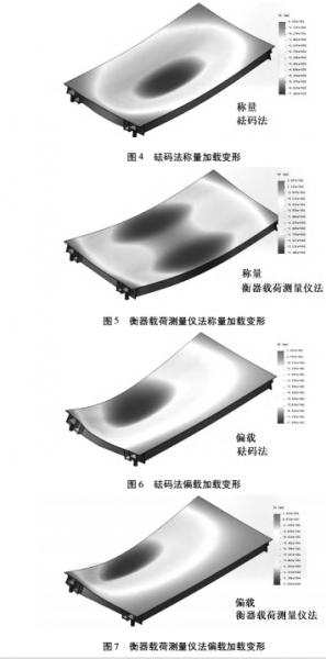 加載狀態(tài)下,承載器的變形量分布如圖 4 ~ 圖 7 所示。可以看出,稱重加載狀態(tài)下,采用砝碼加載時(shí),各支撐點(diǎn)處形變較大; 偏載狀態(tài)下,采用衡器載荷測量儀時(shí)相應(yīng)支撐點(diǎn)處形變較大。由于稱重傳感器的下端與基座間、上端與承載器間均為球面連接,減小了由于承載器變形對傳感器產(chǎn)生的附加彎矩; 承載器變形后,承載器 - 傳感器連接處發(fā)生傾斜,傳感器彈性體所受的側(cè)向力分量增大,由此產(chǎn)生的寄生分量將對示值產(chǎn)生影響。由于施加的標(biāo)準(zhǔn)質(zhì)量一致,傾斜角位移越大,用于傳感器輸出的力分量數(shù)值越小,因此地磅示值也越小。在不考慮其他因素時(shí),稱重檢定結(jié)果中可能表現(xiàn)出砝碼法誤差偏小的趨勢,而在偏載檢定結(jié)果中可能表現(xiàn)出衡器載荷測量儀法誤差偏小的趨勢。由分析結(jié)果可以得到,兩種方法下稱重傳感器連接處的角度相差約為 0. 1% ,但由于傳感器特性各異,示值偏差無法準(zhǔn)確定量計(jì)算。